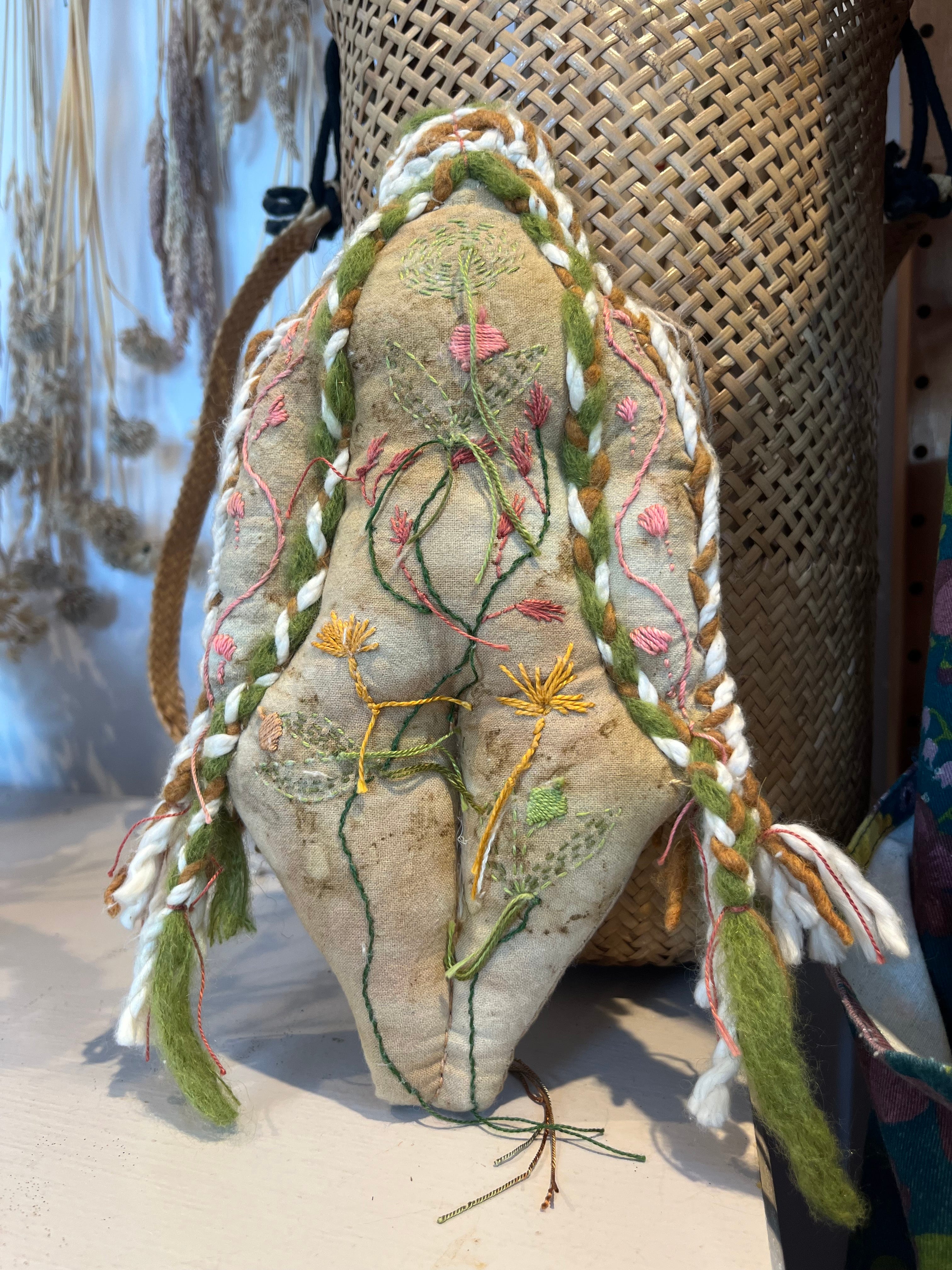 The practice of slow stitching, feels like drawing with needle and thread allowing each piece to guide my hands. The slow contemplative process of following the markings and print, has been a source of deep delight for me. The moons hang full and rich beaming down on the stitched patterns, dried botanicals and lyrical phrases echoing characteristics of the month.