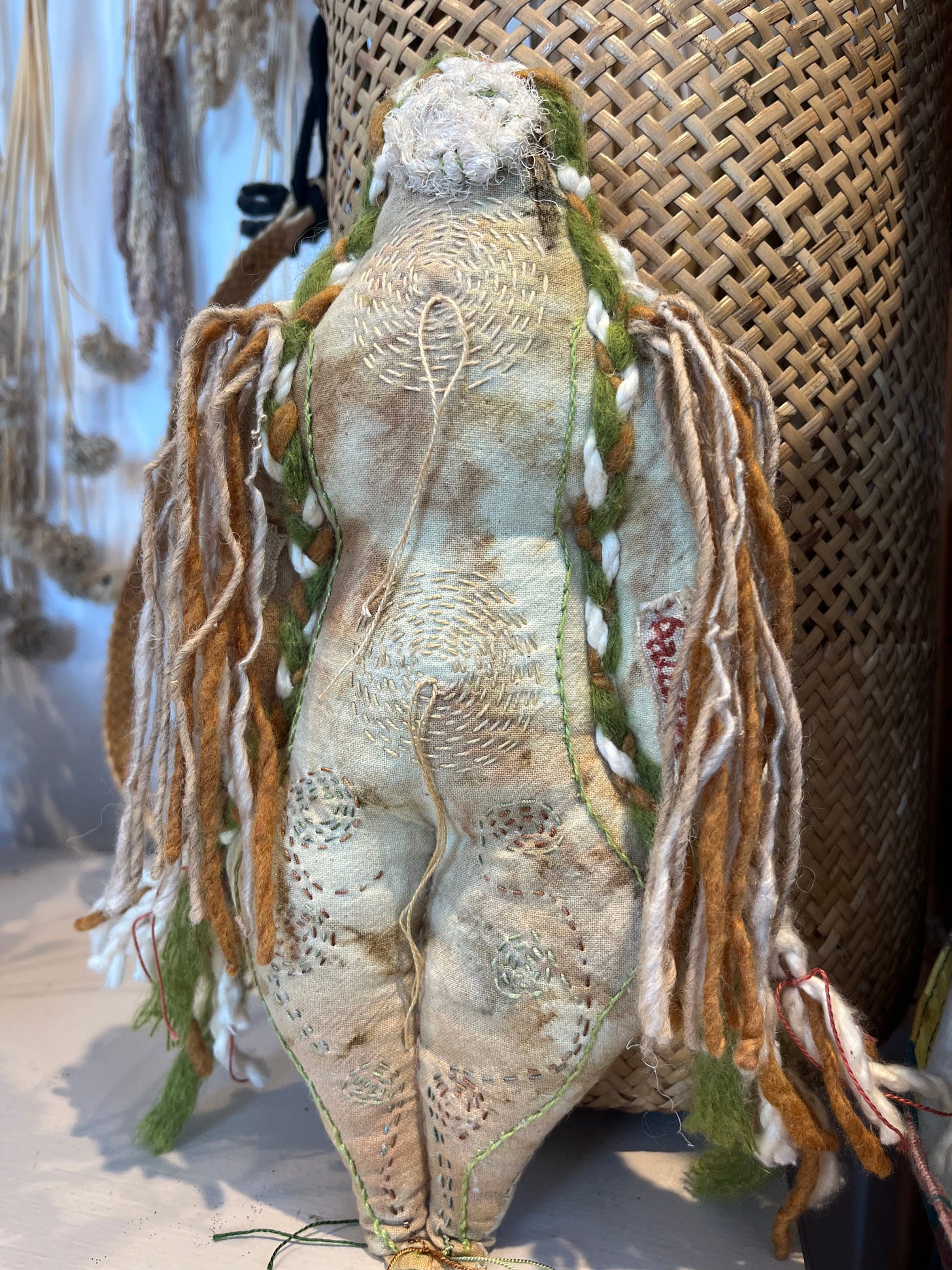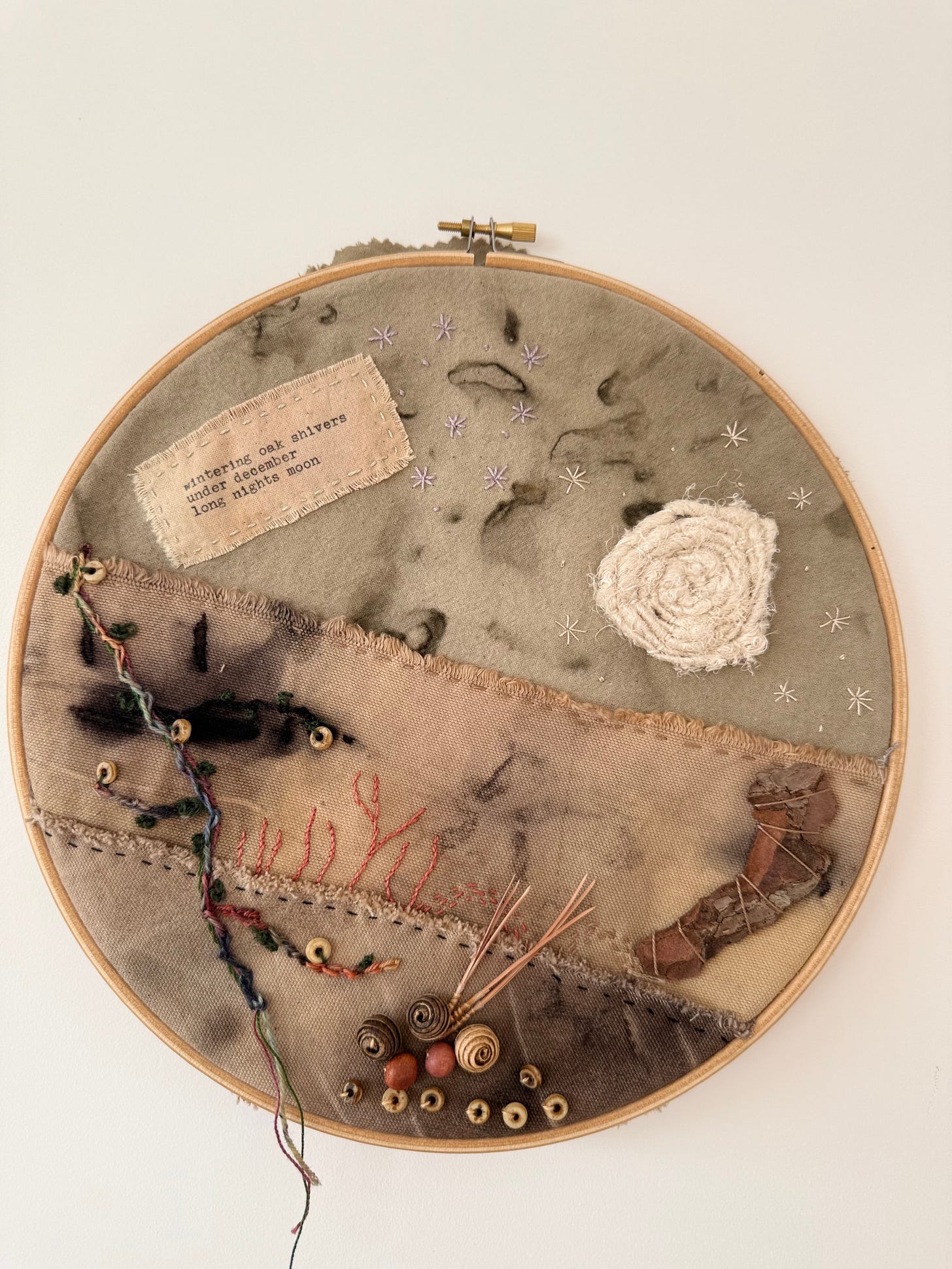 I’ve spent the last several months creating a collection of moon circles, thirteen embroidery hoop pieces each invoking a full moon. These monthly moons are crafted from vintage and pre-loved cotton, linen, and silk textiles marked by botanical imprints. These quiet imaginings hold the hush of the living world, in different pigments and textures offered by each season.